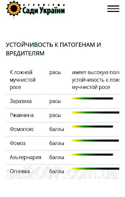 Заразу 7р A-G, Ржавиця-9Б, Фомопсіс-7Б, Фомоз-8Б, Альтернарія — 7Б, Вогнівка — 9Б,Моль-9Б.